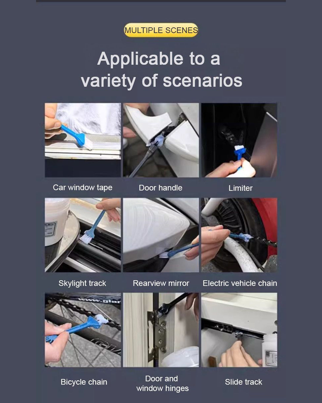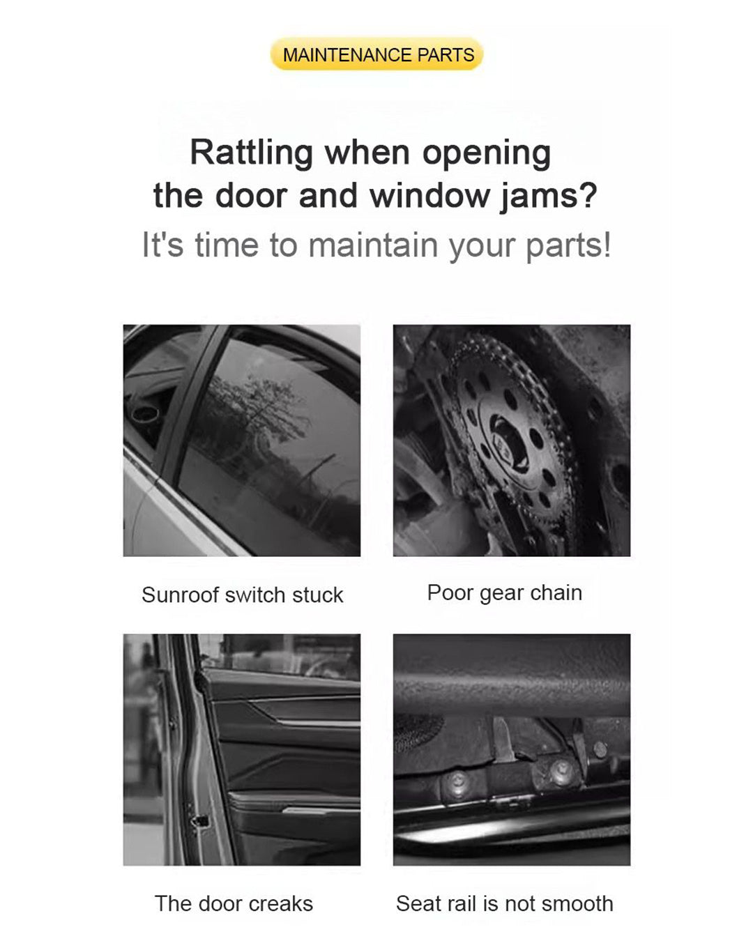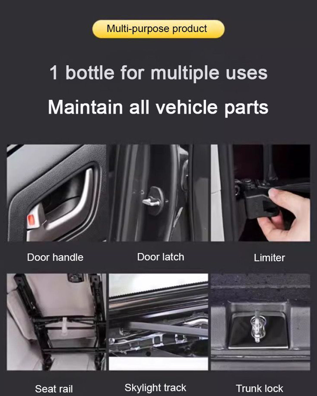 - Wheel bearings, seat rails, gears, sunroof tracks, and door hinges.